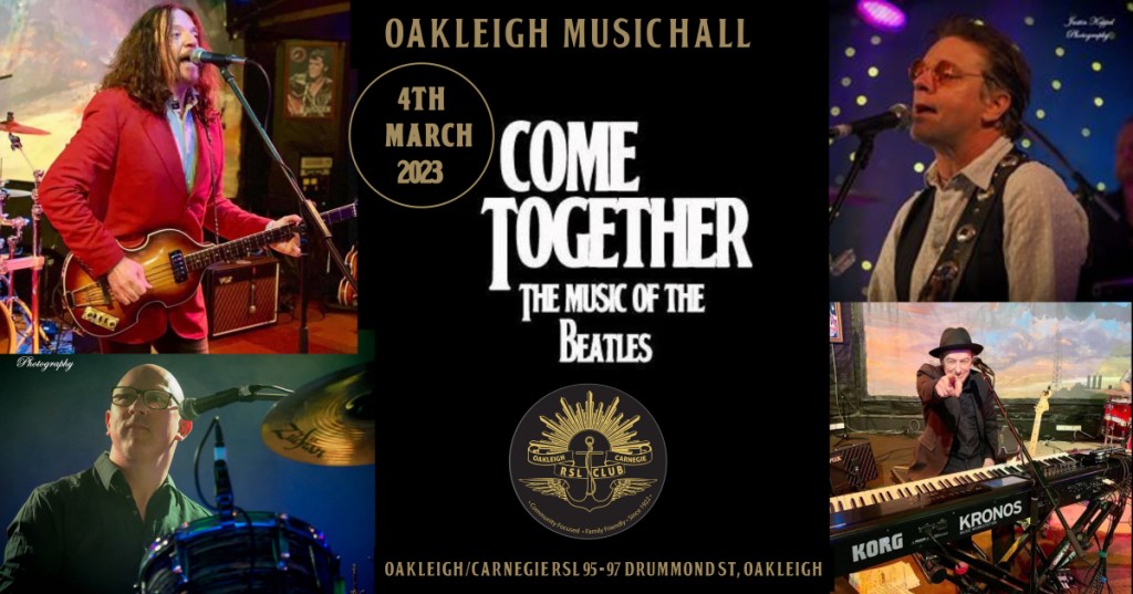A sensational night of classic Beatles hits is in store at Oakleigh Music Hall, performed by one of Melbourne’s leading interpreters of the Fab Four; featuring Phil Smith, Gary Young, Cres Crisp and Lee Dryden. Including ‘Here Comes The Sun’, ‘Let It Be’, ‘Yesterday’, ‘Twist & Shout’, ‘Blackbird’, ‘I Saw Her Standing There’, ‘While My Guitar Gently Weeps’ and many more…
