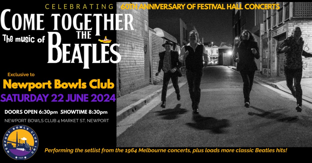 1964 was a busy year for The Beatles! More specifically, June 2024 marks 60 years since the Fab Four visited Melbourne, performing 3 concerts at Festival Hall. Join us for an exclusive show at Newport Bowls Club on Saturday 22nd June 2024, where we’ll be performing the same setlist performed at all 3 shows, in its entirety, plus loads more Beatles classic hits!