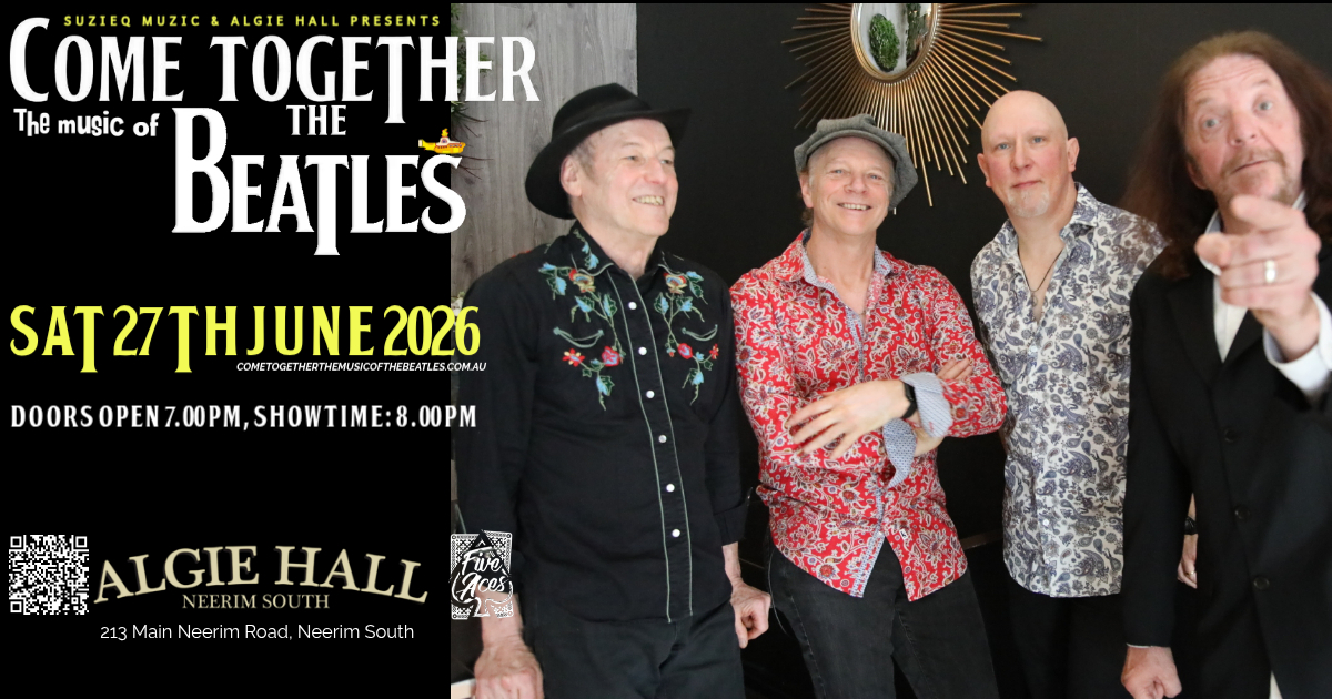 We are excited to announce that we will be returning to the magnificent Algie Hall, Neerim South in 2026! Join us for an unforgettable night celebrating the music of The Beatles! This incredible show will feature some of Australia’s finest musicians, bringing to life the legendary songs that shaped a generation. From the early hits of “She Loves You” and “I Want to Hold Your Hand” to the iconic sounds of “Hey Jude” and “Let It Be,” this show is a must-see for Beatles fans old and new.