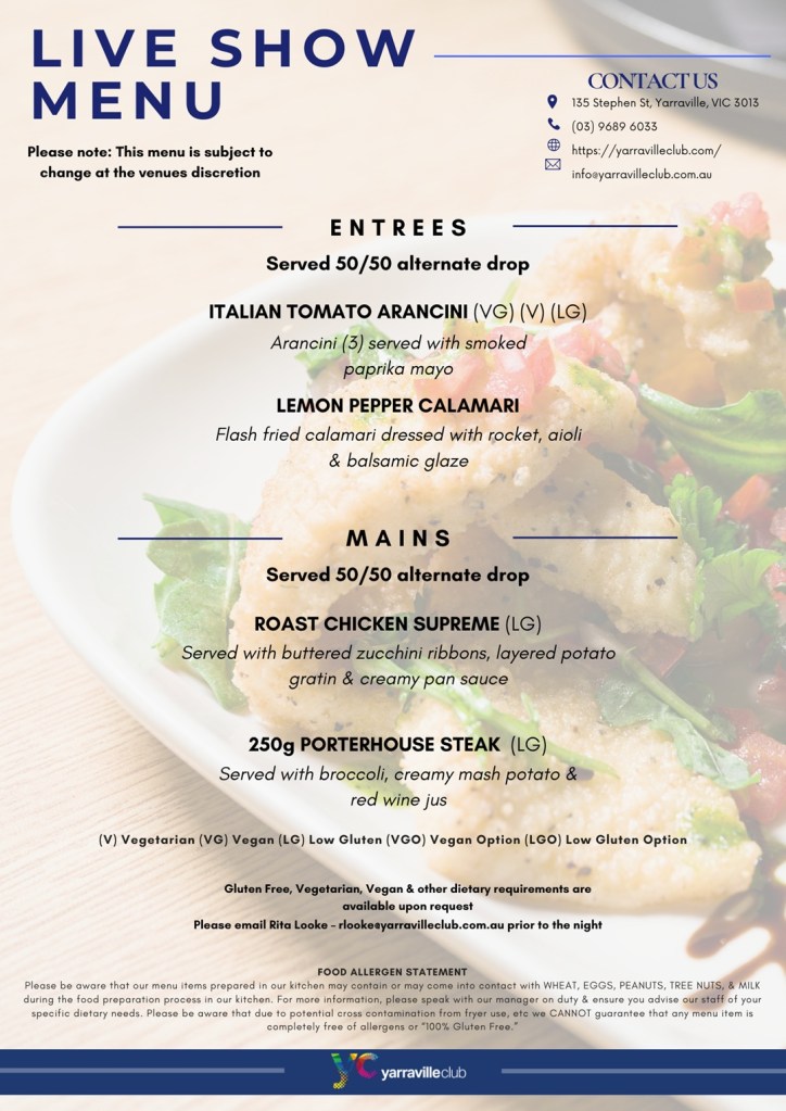 We’re excited to be celebrating the 60th Anniversary of the Beatles’ HELP album, an exclusive show at Yarraville Live!! We’ll be performing the album in its entirety, plus loads more of The Beatles classic hits. Delicious Dinner & Premium Seating Show ticket options available, with a 2 course meal (Entree & Main), served as a 50/50 alternate drop (Menu attached). We’re really looking forward to this one & hope you’ll be there to join us.