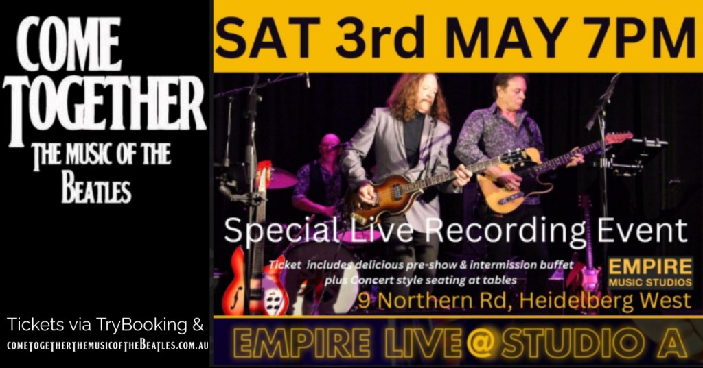 Next Saturday night, 3rd May 2025! Don’t miss this **SPECIAL LIVE RECORDING EVENT** at one of Melbourne’s Premier venues—Studio 52, Empire Music Studios! We’d love for you to be part of the audience & immerse yourself in this world-class music experience, with studio-quality sound, in a major recording venue. You’ll be seated in the heart of the action, in the legendary Studio A, where it’ll feel like the lads from Liverpool are playing right in front of you. Canapés and generous share platters served before the show and during intermission, with comfortable table seating, in the iconic recording studio setting. Don’t miss out on this sensational & unique live event – it’s a night you won’t forget! Limited tickets remaining, for bookings call 0412-686-252 direct to the venue, or go to Trybooking link below